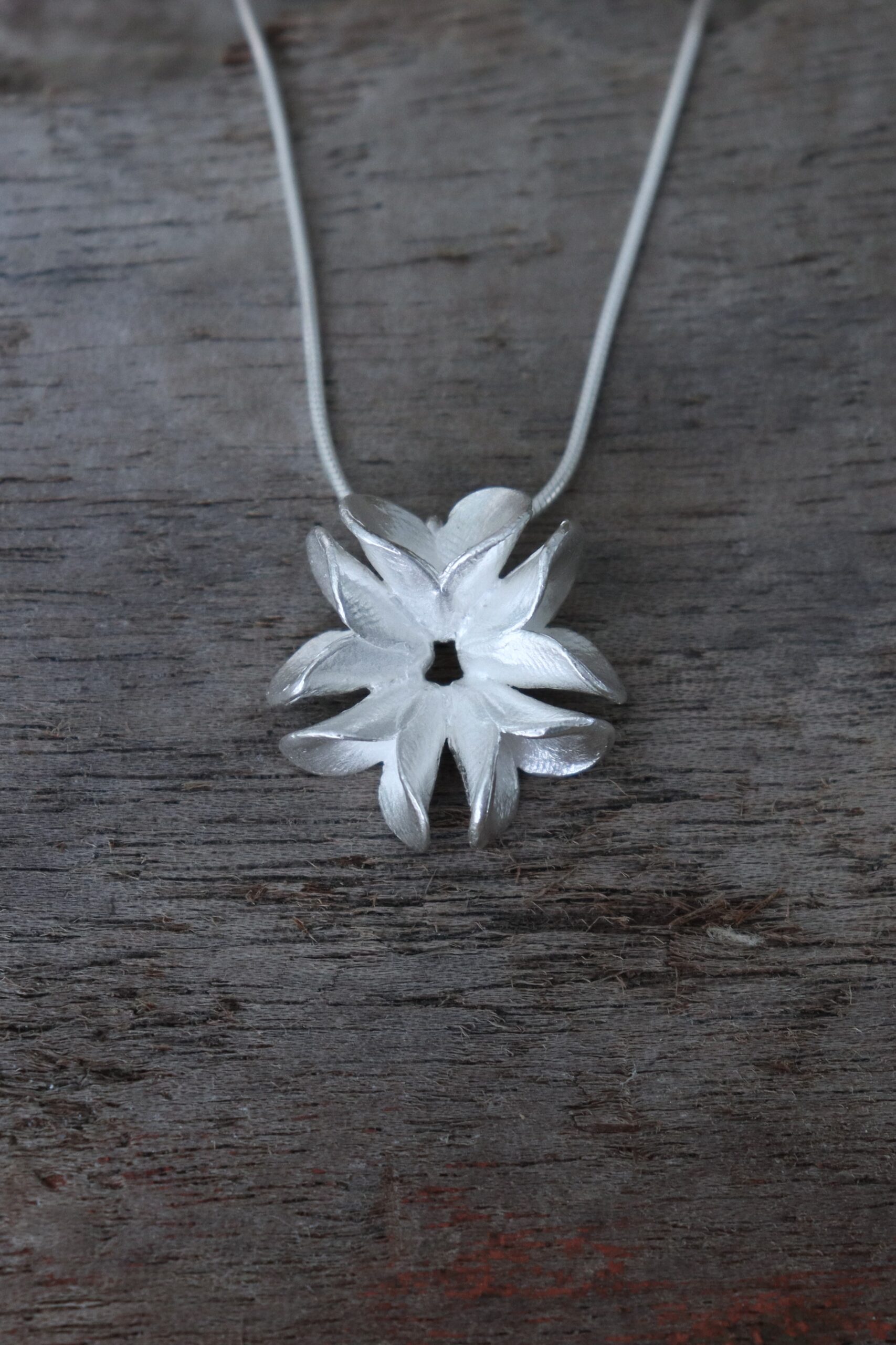 This pendant is from my Fingerprint Pods series inspired by the whimsical seedpods of the Australian native trees; Banksias. The pods are hand moulded in wax by me and therefore have a lovely surface texture from my fingerprints. They are then cast in 925 silver, cleaned and soldered to become a pendant that hangs on a 45cm long snake chain. Elegant and classic style perfect for everyday or to give that special accent to a festive outfit.